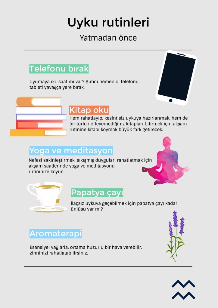 Yatmadan önce yaptıklarımız, ya da yapmadıklarımız yani rutinlerimiz uyku kalitemizi belirleyebiliyor. Küçük bebeği olan ebeveynler bilirler, bebekleri uykuya alıştırabilmek için belli bir saatte, uyku rutini oluşturmak çok önemli. Uyku saati yaklaşırken, aktif oyunlara son vermek, daha sakin bir ortam oluşturmak, enerji veren gıdaları kesmek, ılık bir banyo yaptırmak uykuya geçişi kolaylaştırır. Bu bebeklerde işe yarıyorsa, bizde niye yaramasın?